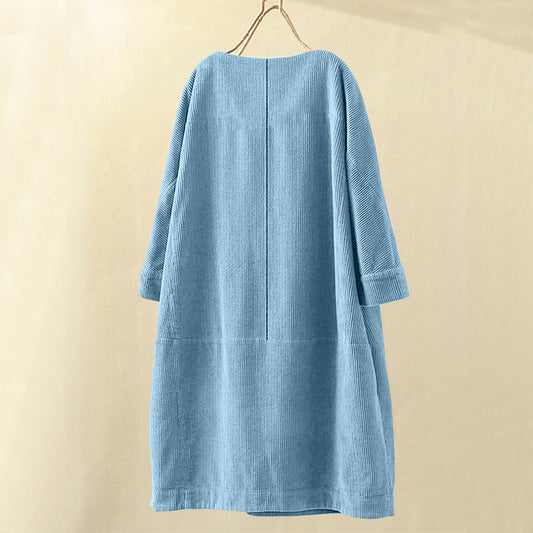 Vestido De Pana Holgado Con Cuello Redondo Y Manga Tres Cuartos