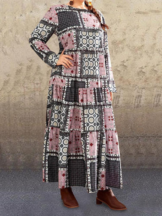 Vestido estampado étnico con cintura de moda de otoño de 2020 cuello redondo falda femenina suelta con gran swing