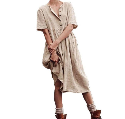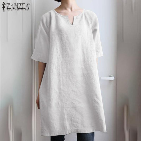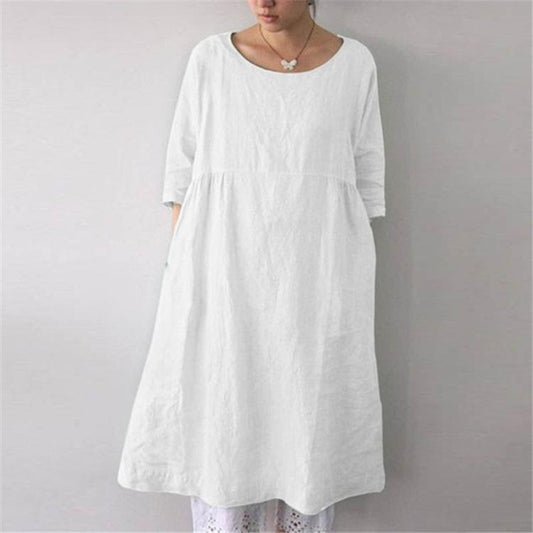 Vestidos de lino sólido con cuello en V de manga 3/4 para mujer