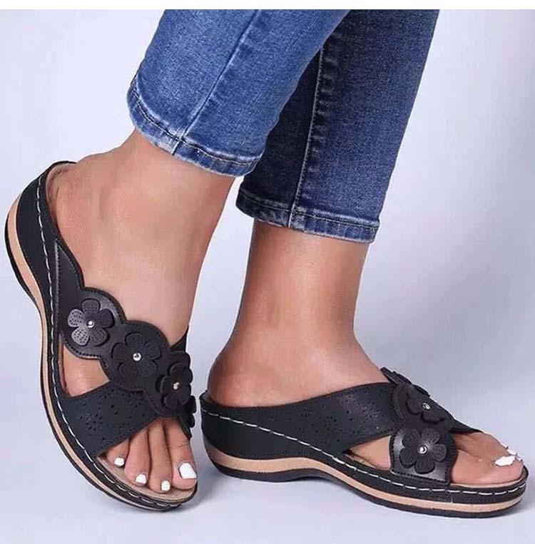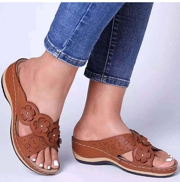 Elementos populares: flores, hueco, costura, tacón de cuña, costura de cuero.