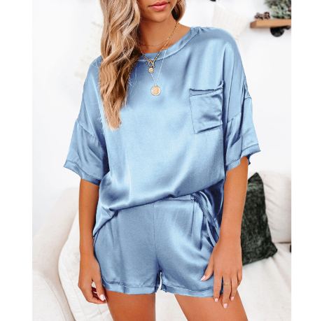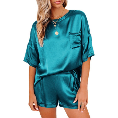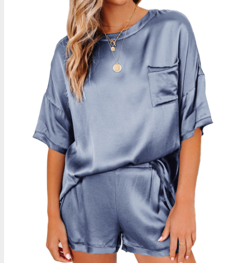 Traje de servicio a domicilio de pijamas de manga corta con cuello redondo y hombros caídos anti-seda de color puro