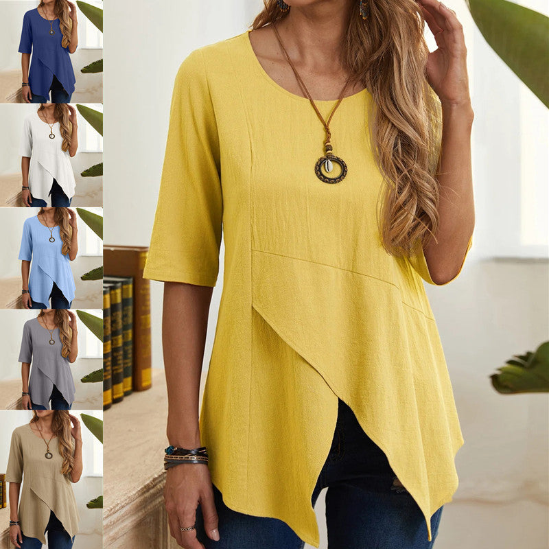 [W-Ropa] Camiseta De Algodón Y Cáñamo De Manga Media Con Cuello Redondo
