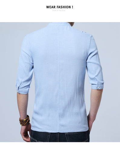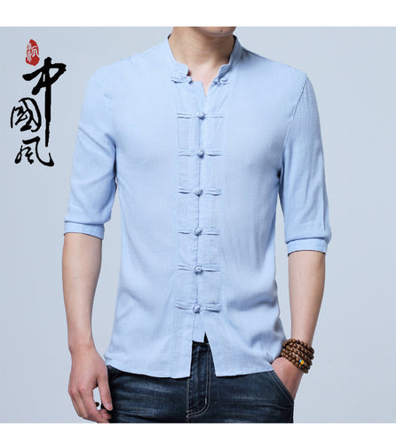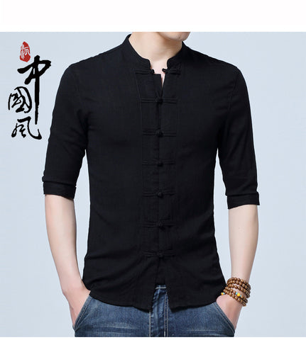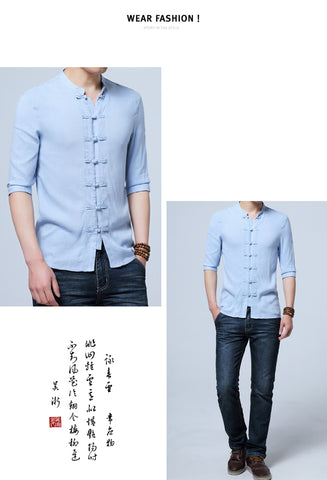Camisa de lino suelto de media manga con cuello mandarín y cierre botón hacia abajo. tiene nudos y ganchos para botones hechos de la misma tela que la camisa. los puños están equipados con botones