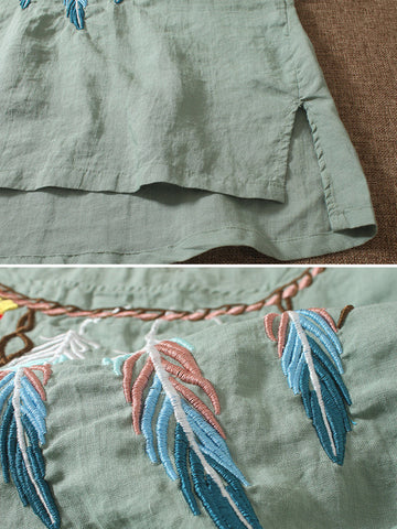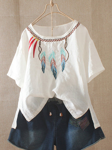 Camiseta mexicana de manga corta y lino con dibujo de pluma