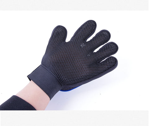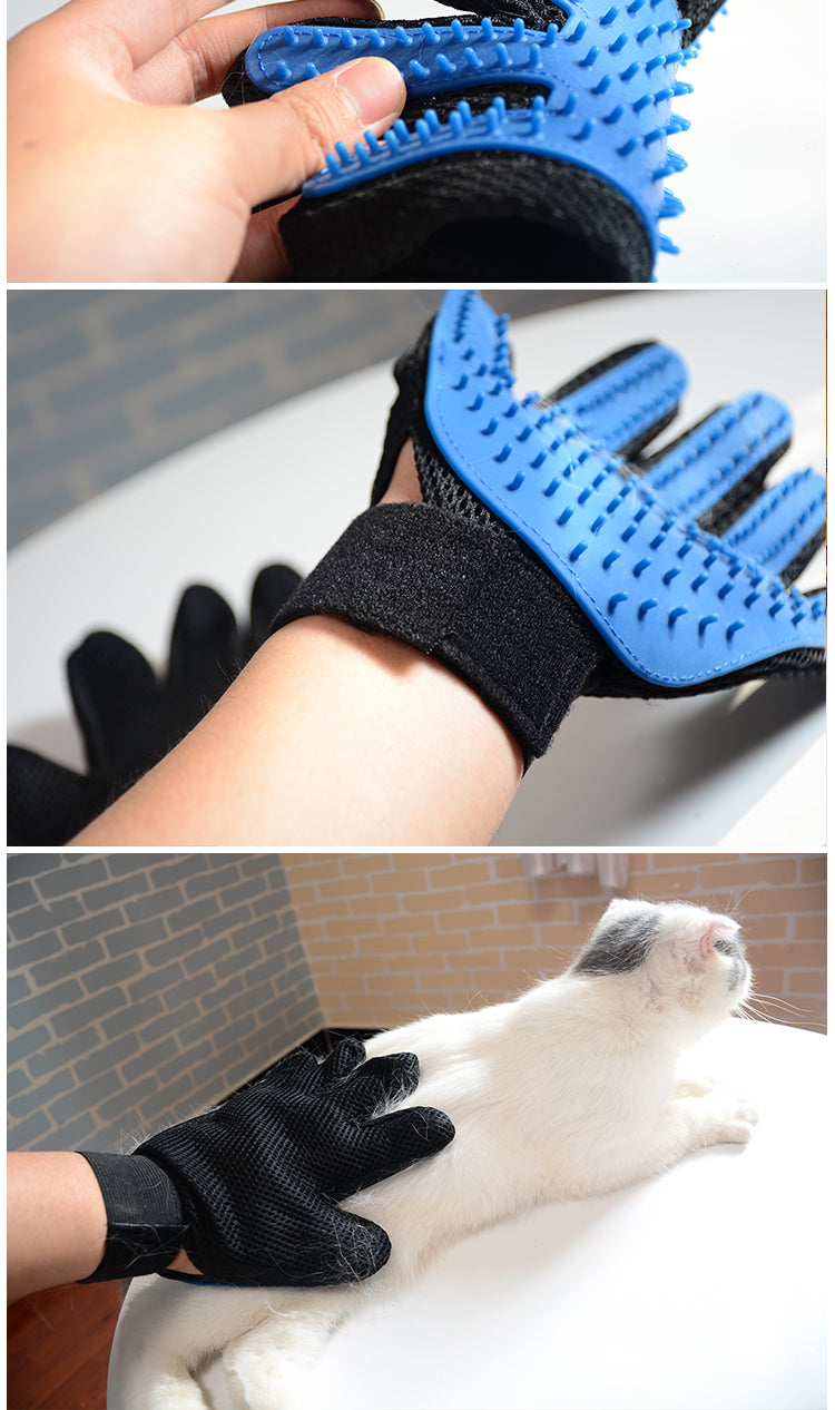 El pelo muerto se pega al guante, haciéndolo fácil pelar y tirar el pelo después de la preparación del perro y del gato, revelando una capa externa sana y brillante.