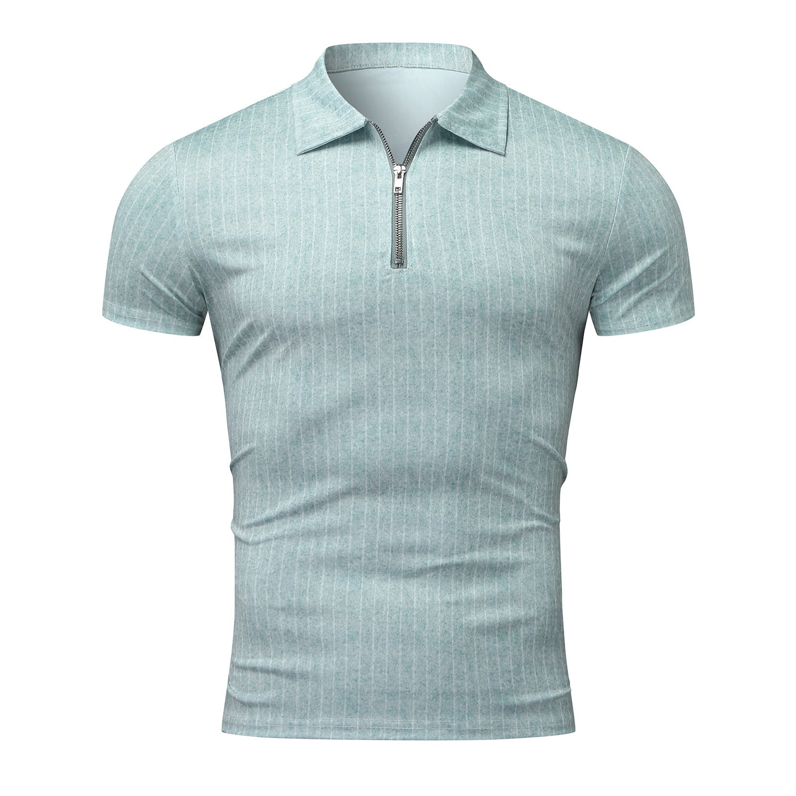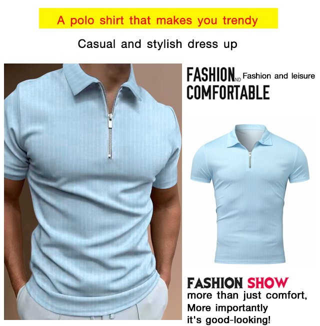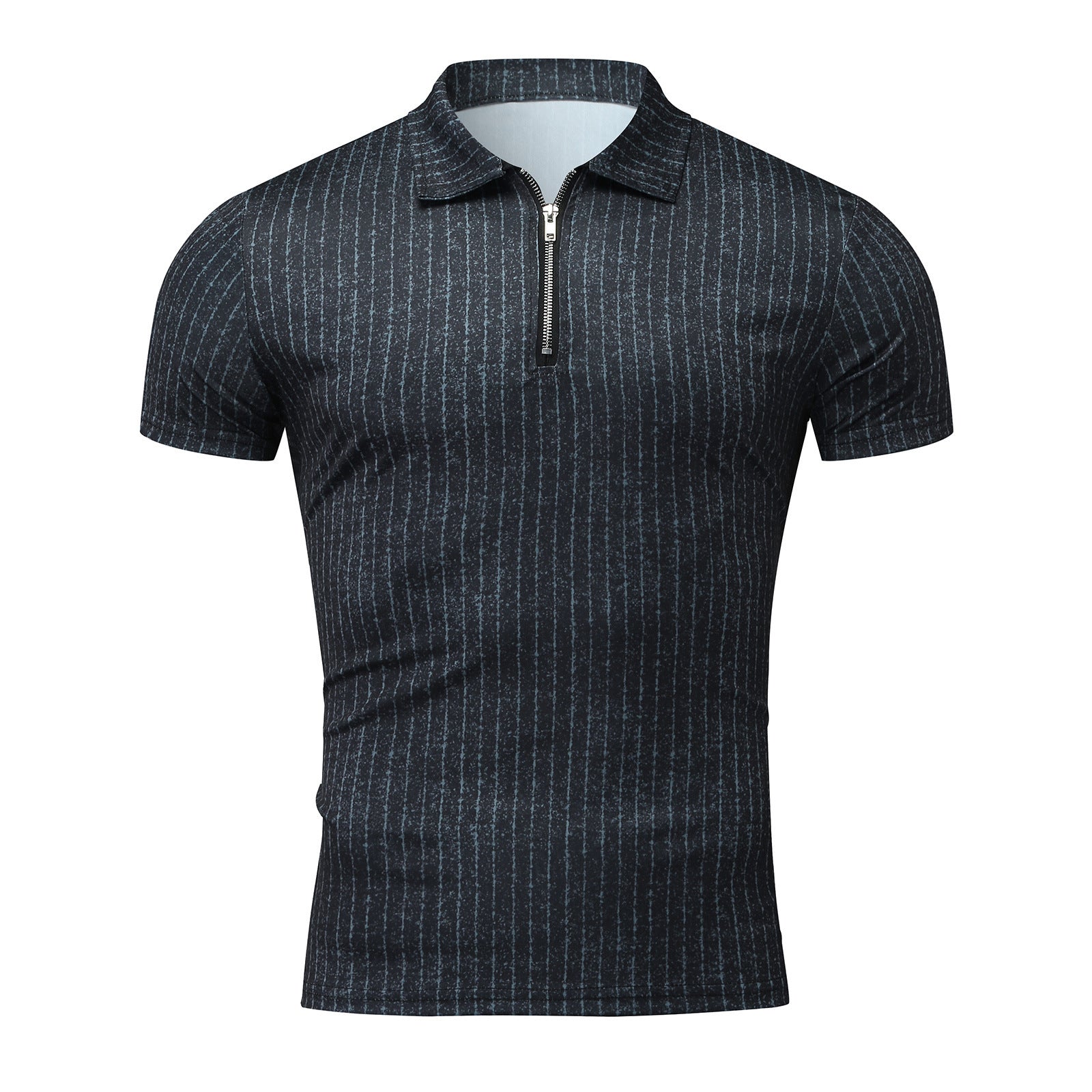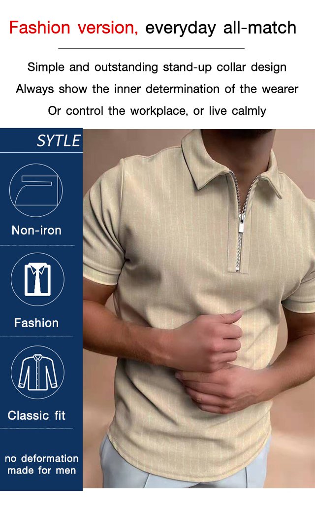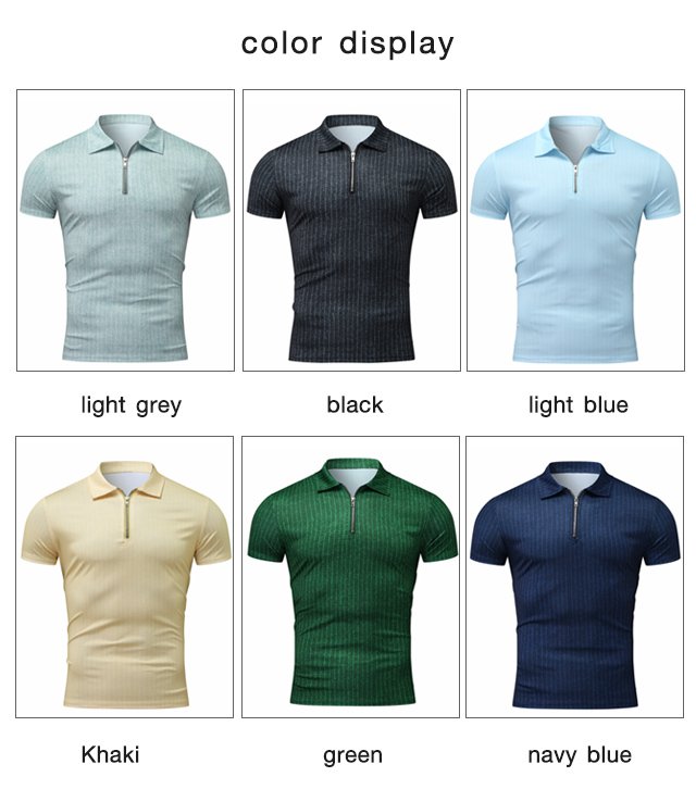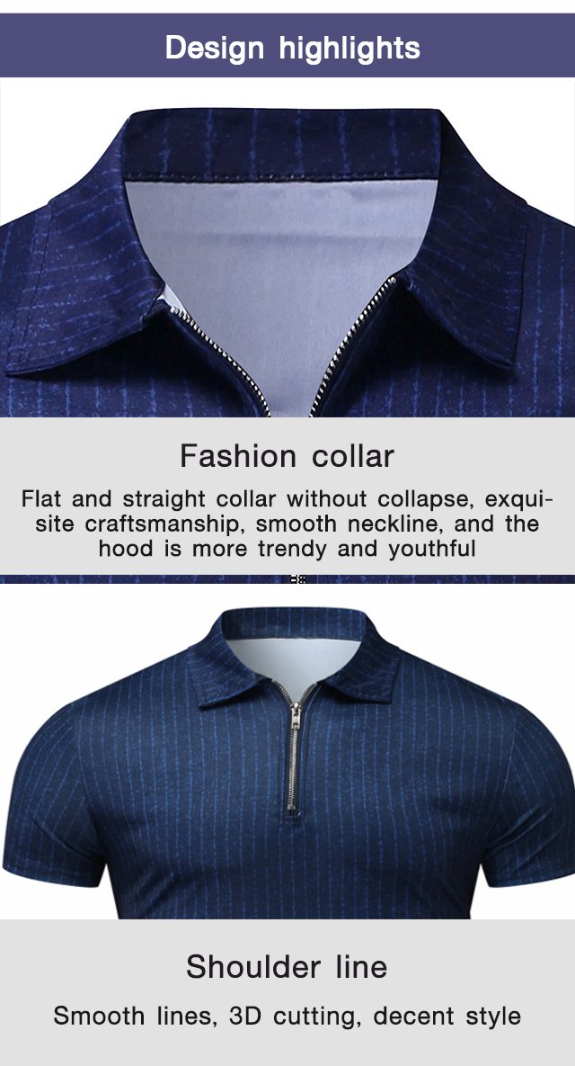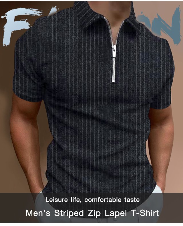 [M-Ropa] Camiseta Casual De Manga Corta A Rayas Con Solapa Y Cremallera Top Slim Fit