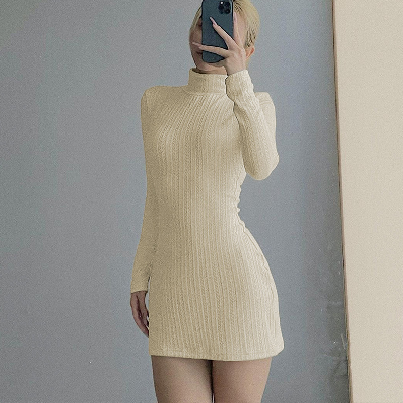 El vestido es un mini - vestido de punto de otoño multifuncional. El vestido cuenta con un corte a de casi todas las figuras, con pequeños detalles de pliegue lateral y cuello alto transpirable.