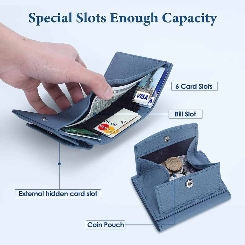 Más importante aún, hay una ranura de tarjeta oculta externa que aumenta la privacidad y la comodidad. Las ranuras de billetes y los bolsillos plegables de monedas proporcionan suficiente espacio para ordenar el efectivo y el cambio. El cierre de botones metálicos añade un toque de elegancia, al tiempo que garantiza la recogida rápida y segura de objetos de valor.