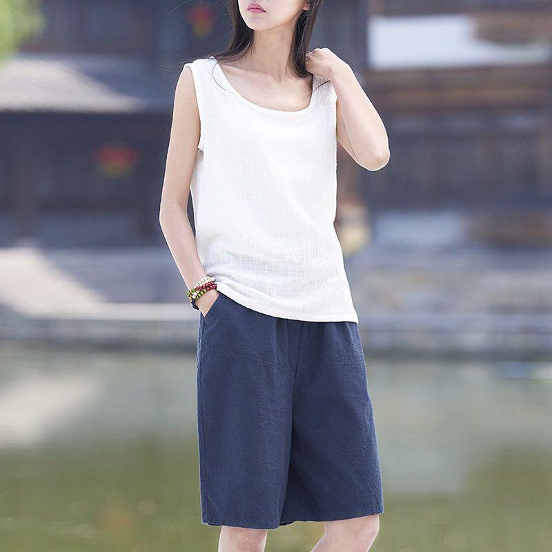 [W-Ropa] Pantalones Anchos De Algodón Y Lino De Media Longitud