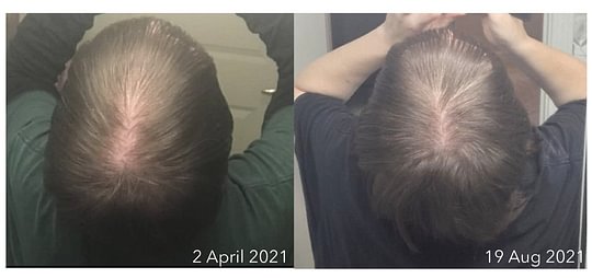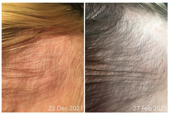 "Dios mío! Realmente funciona! Soy una mujer de 45 a ños que ha adelgazado mi cabello desde que tenía 20 años debido a una enfermedad tiroidea. Empecé a usar este peine láser alrededor del 22 de diciembre de 2021. Afortunadamente, alguien me aconsejó que tomara fotos antes de iniciar cualquier tratamiento. El izquierdo comenzó en enero. En los últimos dos meses, he estado usando el peine láser tres veces a la semana durante 11 minutos como se me ordenó. N. ¡No puedo decir si funciona mirándome al espejo, así que tomé más fotos esta mañana, no puedo creer lo que veo! ¡Hay una gran diferencia! ¡Estoy conmocionado y emocionado! ¡Funciona! "Susan Bratton