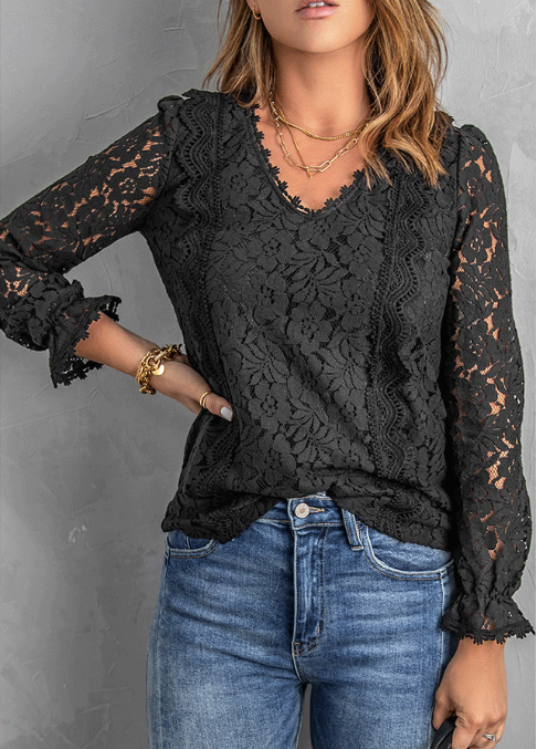[W-Ropa] Chaqueta De Encaje De Manga Larga De Encaje Sólido