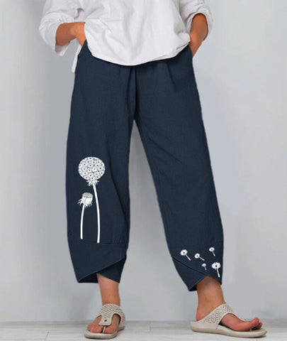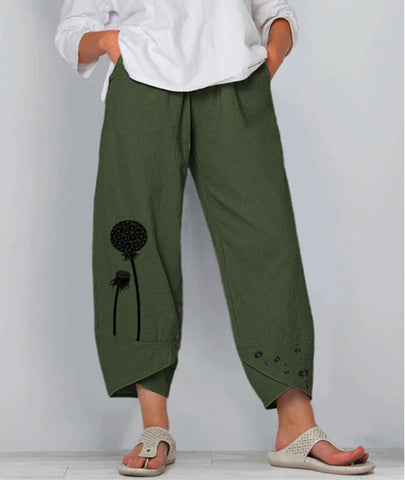 Verano casual de algodón lino suelto estampado pantalones de patas anchas