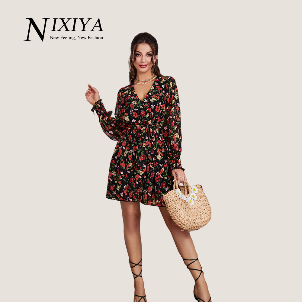 [W-Ropa] Falda Floral De Manga Larga Para Mujer Con Vestido Retro Francés 2022