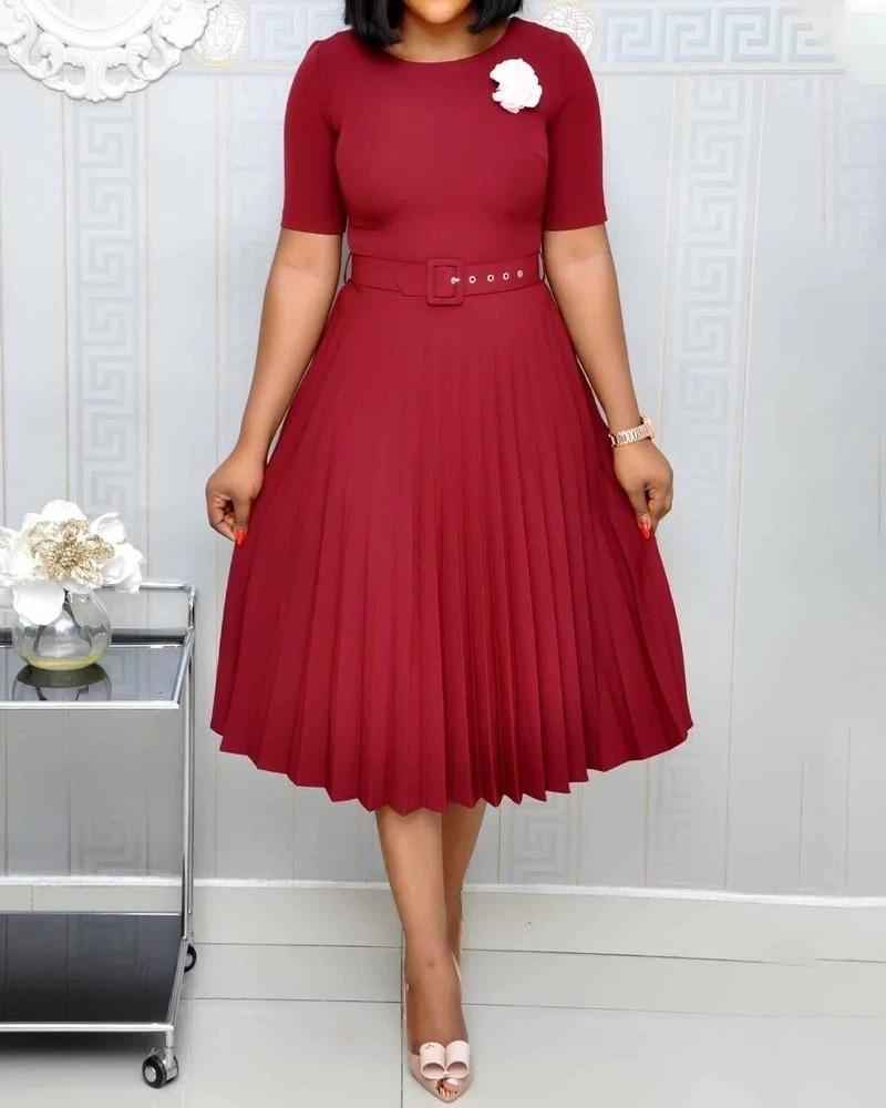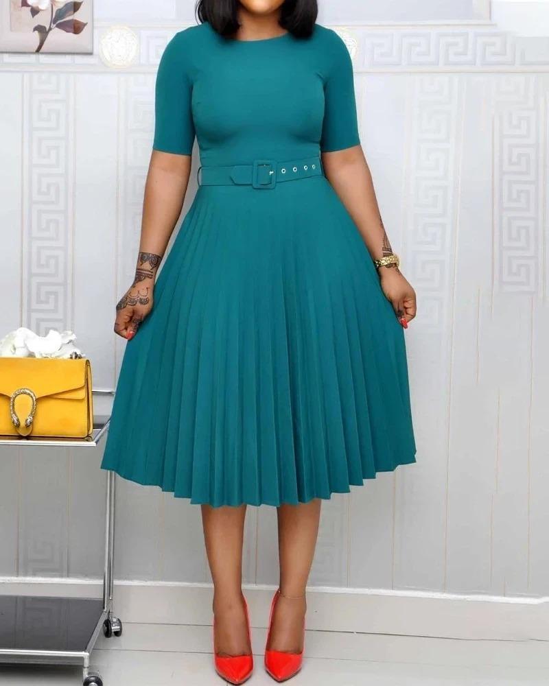 Vestido plisado de manga corta en color liso en la rodilla