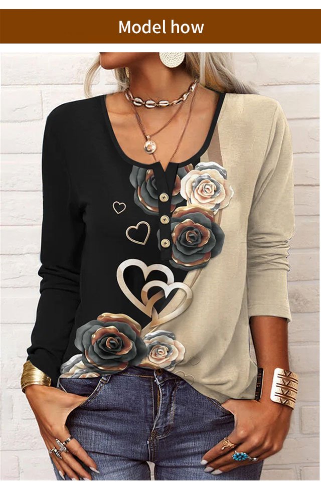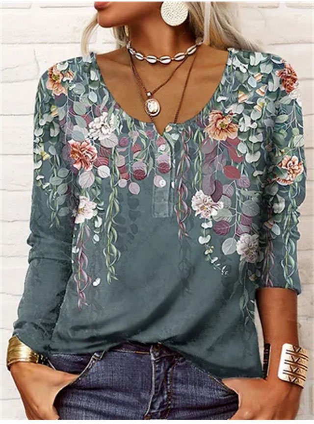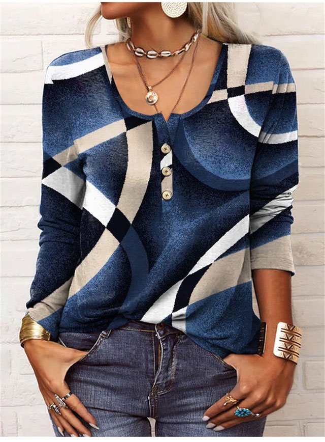 [W-Ropa] Camiseta De Botón De Cuello En U Impresa Geométricamente