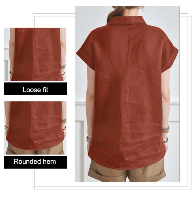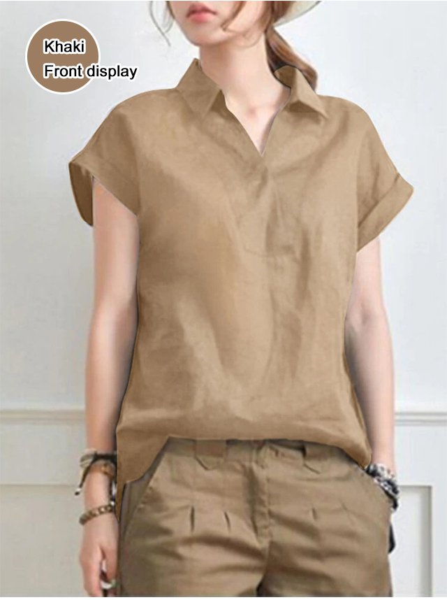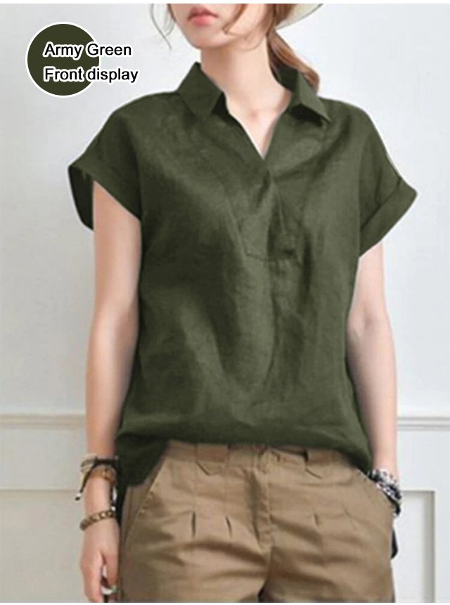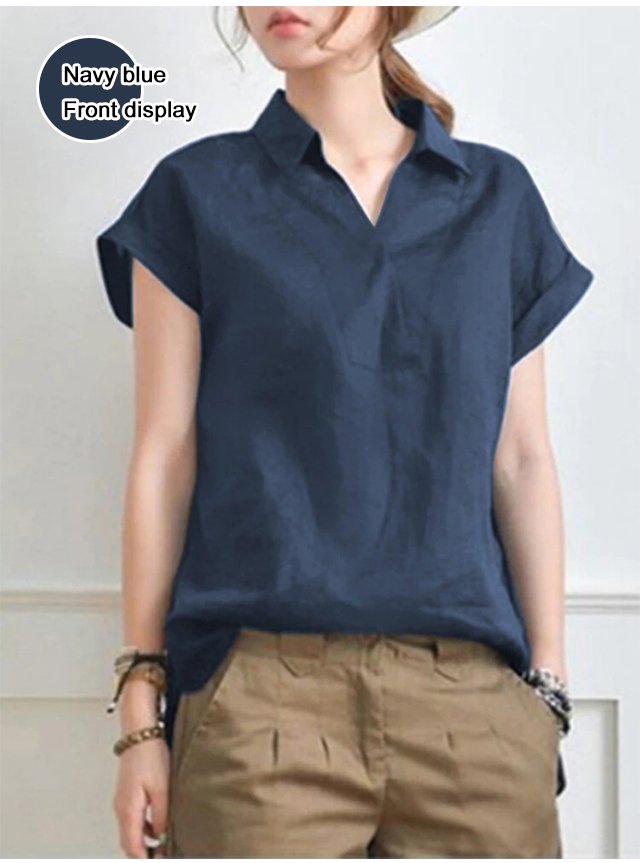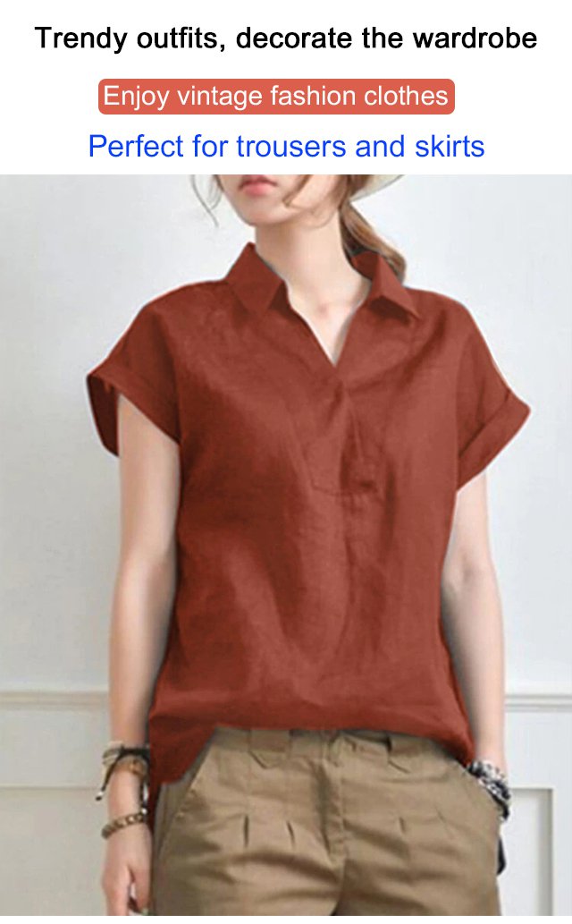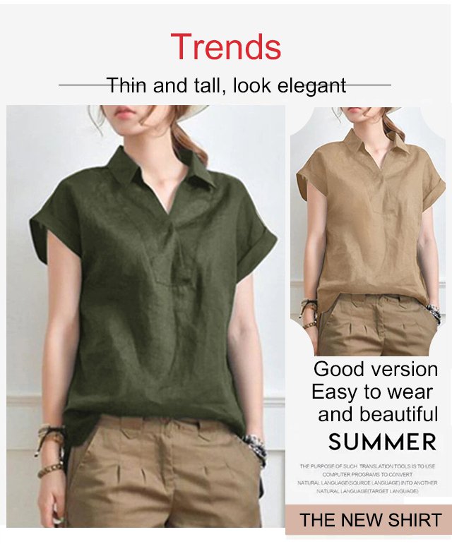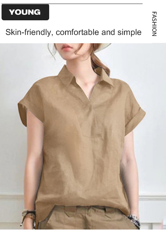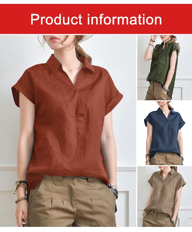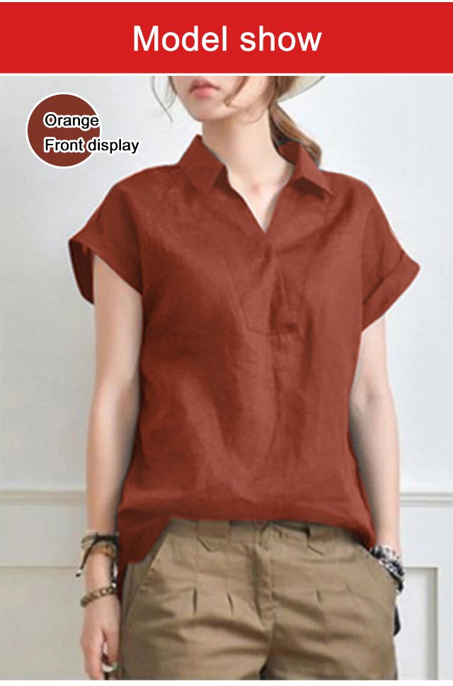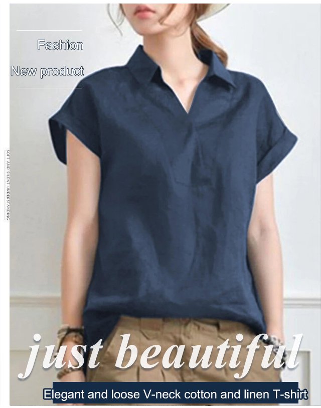 [W-Ropa] Camiseta Elegante Y Holgada De Algodón Y Lino Con Cuello De Pico
