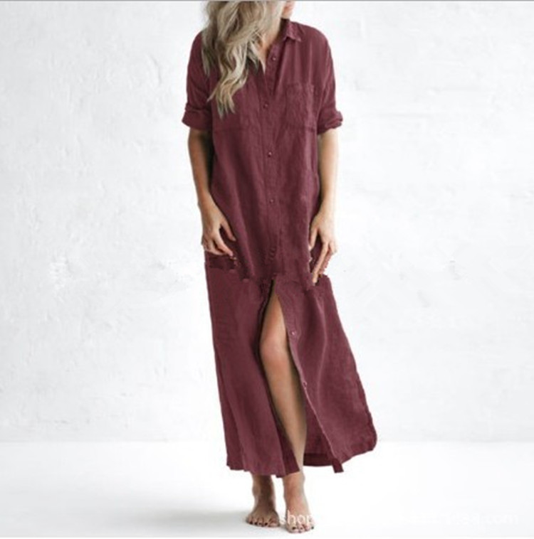 [W-Ropa] Vestido Camisero De Cintura Alta De Lino Hotouch